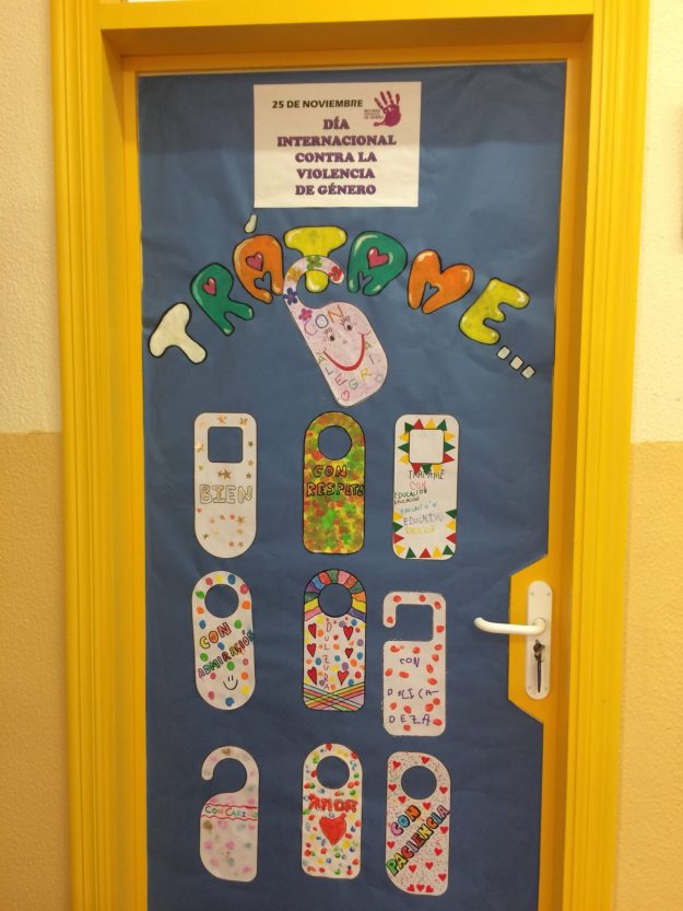 Este año hemos apostado por los BUENOS TRATOS para tener siempre presente los DERECHOS HUMANOS. Educar en IGUALDAD para eliminar la violencia de género. Estos colgadores nos abren la puerta proporcionando una salida al problema y conseguir así nuestro objetivo.